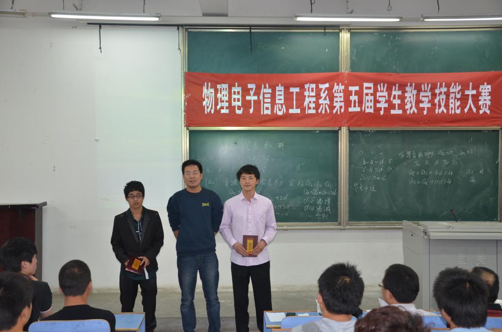 本届大赛由系团总支员工会精心策划,认真组织。有20多名选手参加预赛,最终有8名选手脱颖而出进入决赛。比赛中,吴婷同学用幽默简洁的语言讲解了“简单的随机抽样”,台上台下气氛轻松和谐。杨一帆同学紧跟社会热点,用一个简单的小故事为同学们解释了“次贷危机”产生的原因。靳巧丽同学用生动的例子来引出压强的概念及公式,在不断和同学们的互动中带动了课堂的活跃气氛。张清同学讲了“余弦定理的证明及其应用”,板书工整认真,内容深入浅出。参赛选手用自己对课堂教学的不同理解给同学们展示了一个丰富多彩且内容充实的课堂场景。
