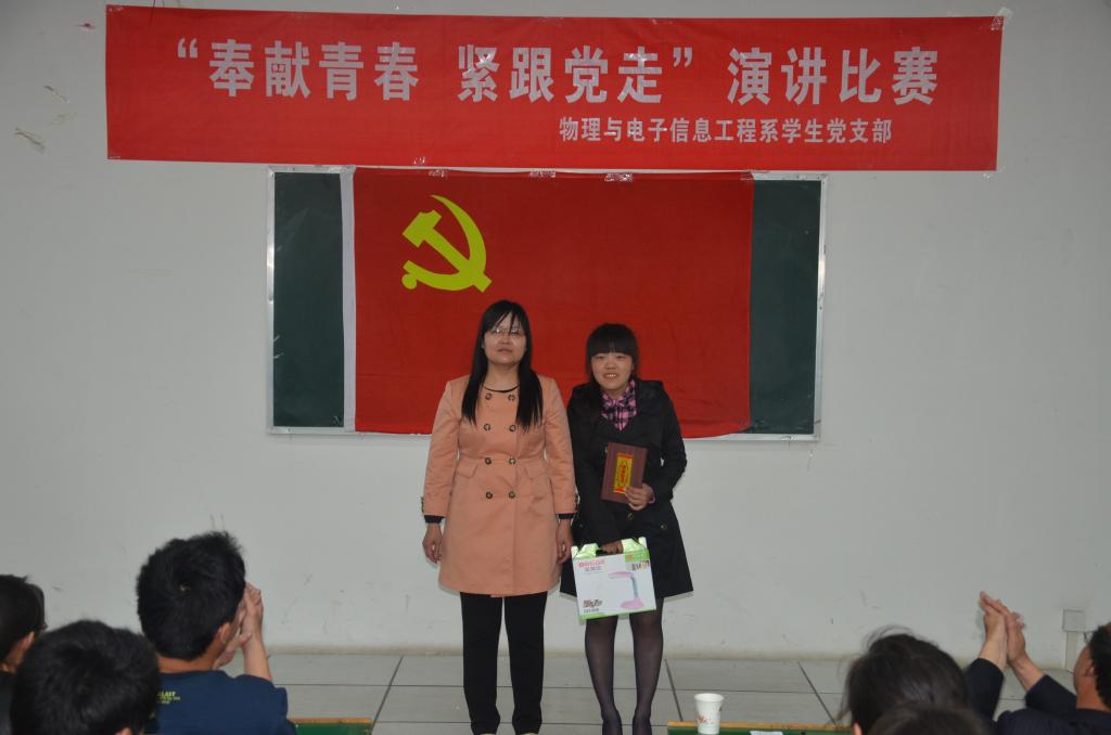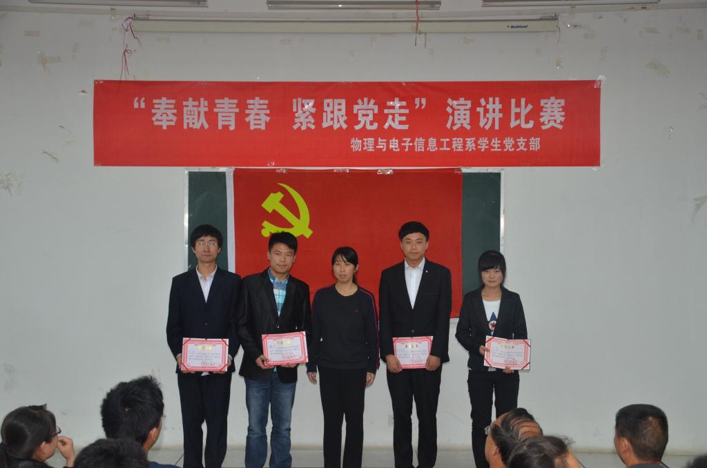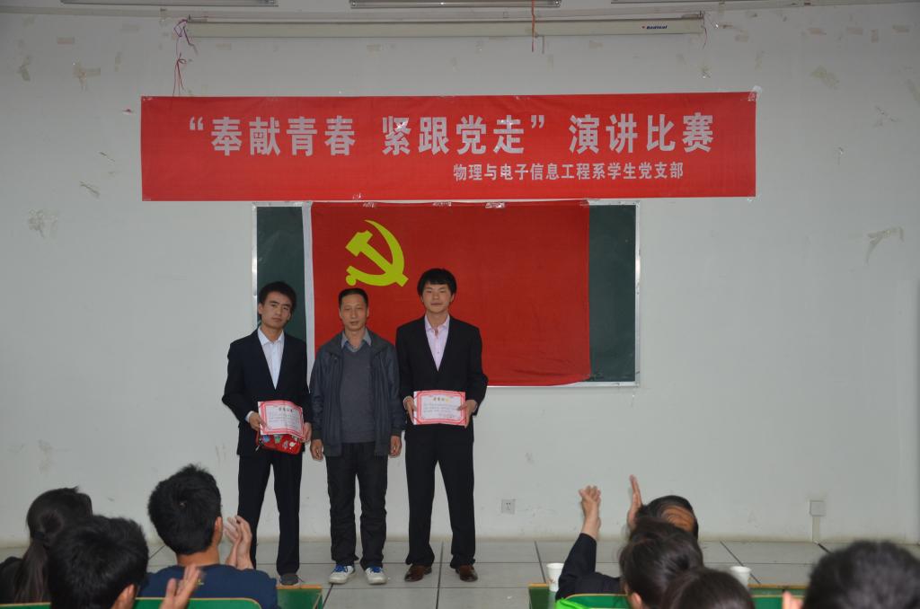 4月18日晚,物理与电子信息工程系员工党支部在报告厅1举办了以“奉献青春紧跟党走”为主题的演讲比赛,物理与电子信息工程系党总支书记张秦中、党政办公室主任杨延锋、党总支委员侯茹、团总支书记陈倩、辅导员魏书灵和李磊老师出席并担任评委,比赛由刘伟、宋丹主持,200余名员工参加。