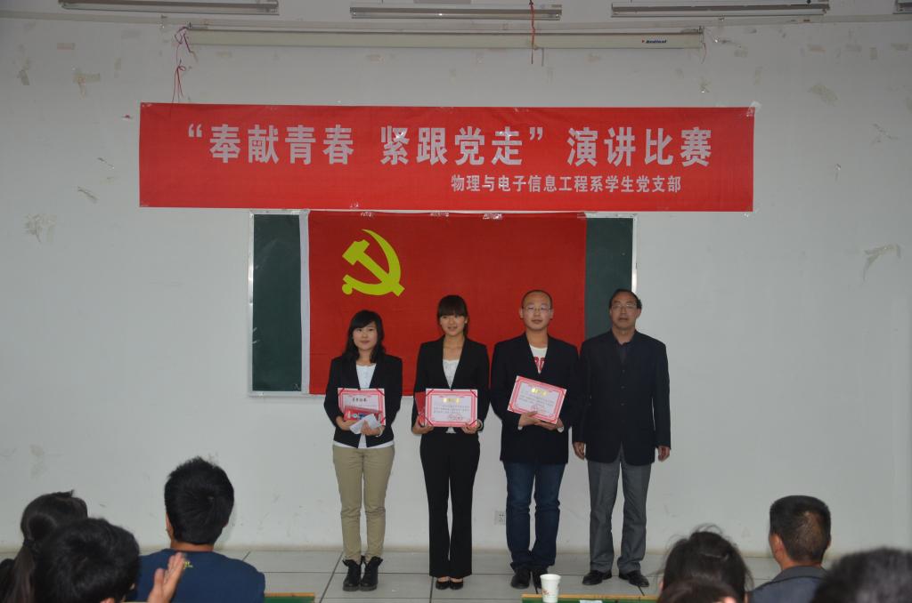 经过紧张激烈的角逐,冯婷婷同学的演讲《永远跟党走》获得一等奖;史兵兵、杨一帆同学的演讲《青春不停步,永跟党走》、《青春献祖国,永远跟党走》获得二等奖;宋丹、刘贝贝、关浩同学的演讲获得三等奖;魏杰、叶学雷、田远、孟芮同学的演讲获得优秀奖。获奖同学分别由张秦中、杨延锋、魏书灵和侯茹颁奖并合影留念,至此,本次比赛活动圆满结束!