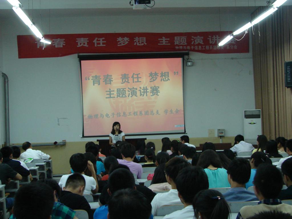 6月5日晚,物理与电子信息工程系在多媒体17举办了以“青春 责任 梦想”为主题的演讲比赛,物理与电子信息工程系党总支书记张秦中、团总支书记陈倩和辅导员魏书灵、李磊以及杨琳、王博、谢谦老师出席并担任评委,近200余名员工观看了比赛。