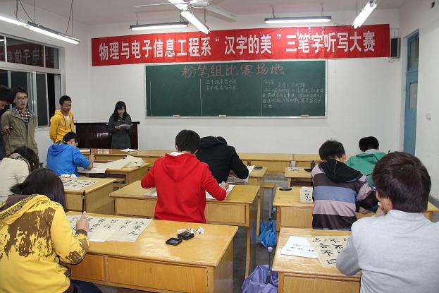 本次比赛分毛笔、粉笔、钢笔三种形式。从10月22日开始的各班初赛参加人数257人到复赛时的139人,直至10月30日进入决赛的毛笔组9人、钢笔组9人、粉笔组9人,物理与电子信息工程系共计270人参与到这个活动中。
