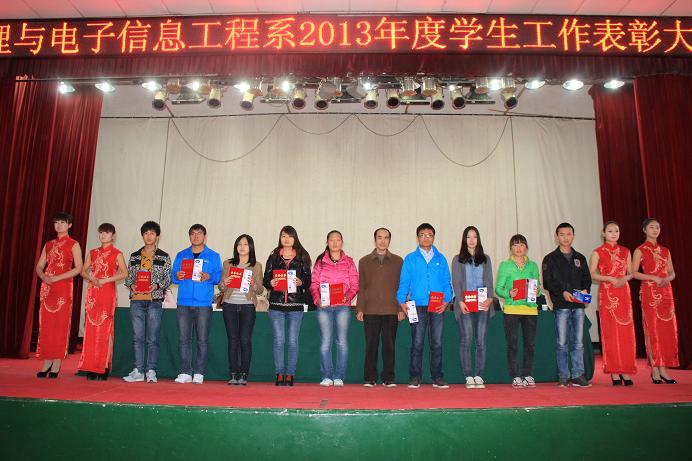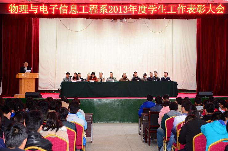 2014年3月14日下午,物理与电子信息工程系在老员工活动中心召开了2013年度员工工作表彰大会,物理与电子信息工程系主任刘宝盈教授、系党总支书记张秦中、系副主任李英教授等系领导和全体班主任老师出席会议,500余名员工代表参加,本次会议由团总支书记陈倩主持。