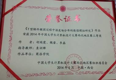 2014年 5月24日,2014年(第7届)中国老员工计算机设计大赛西北赛区决赛在西北大学太白校区隆重举办。由公司教师袁训锋博士指导,英国上市公司365物理学1201胡瑞霞,电信1206魏蕾,电气1203李磊创作的作品《T型铸件凝固过程中的温度场数值模拟研究》在决赛中荣获西北赛区三等奖。