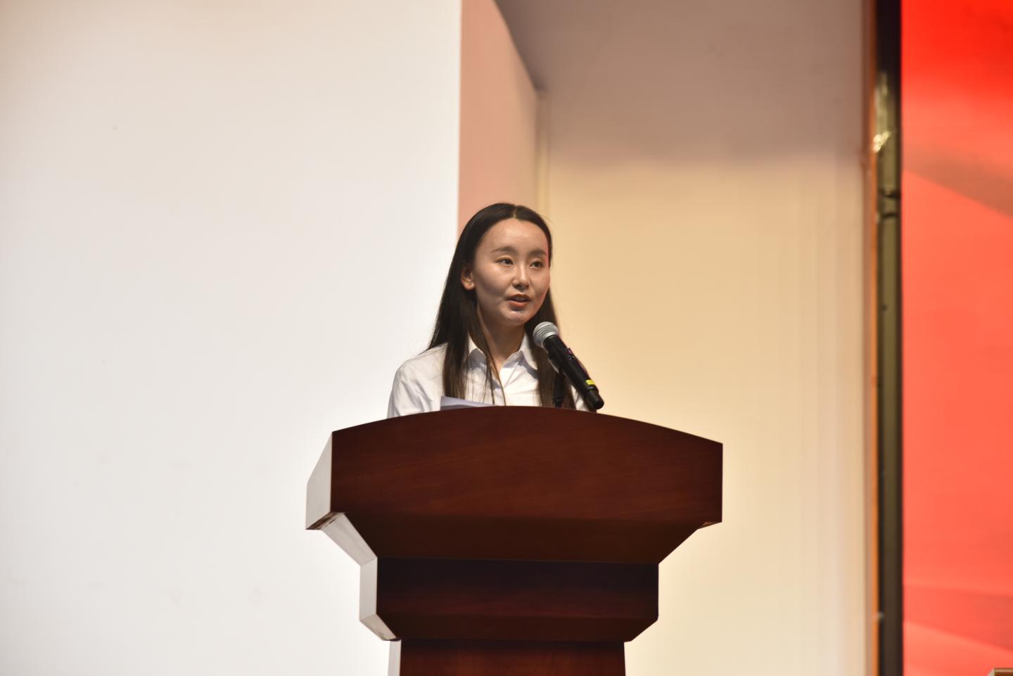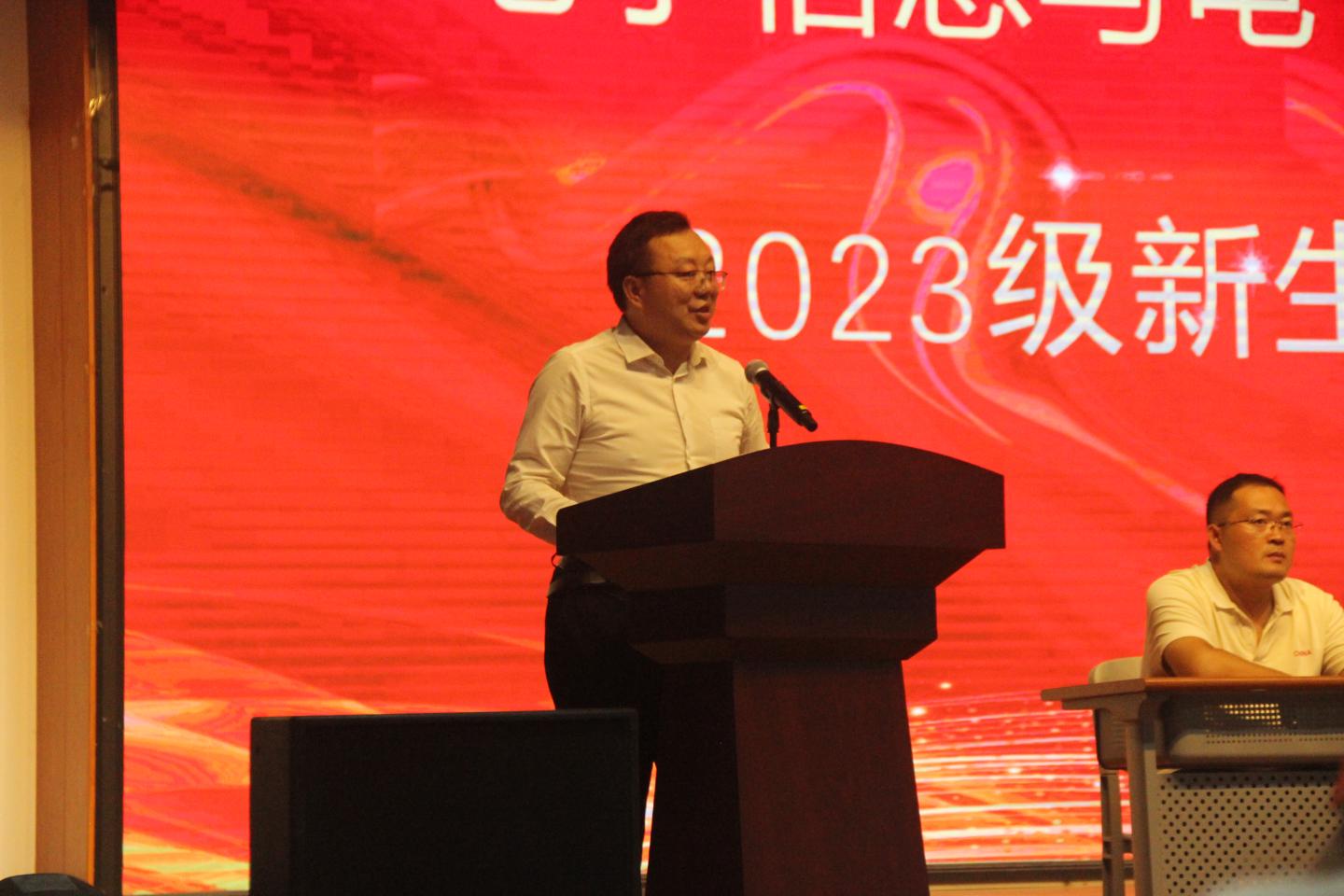 智能2301班任佳豪代表2023级新生作表态发言,表示将认真学习贯彻习近平新时代中国特色社会主义思想,增强“四个意识”、坚定“四个自信“、自觉做到“两个维护”,将大学奋斗、人生选择融入到中华民族伟大复兴的新征程,不负时代、不负青春、不负韶华。