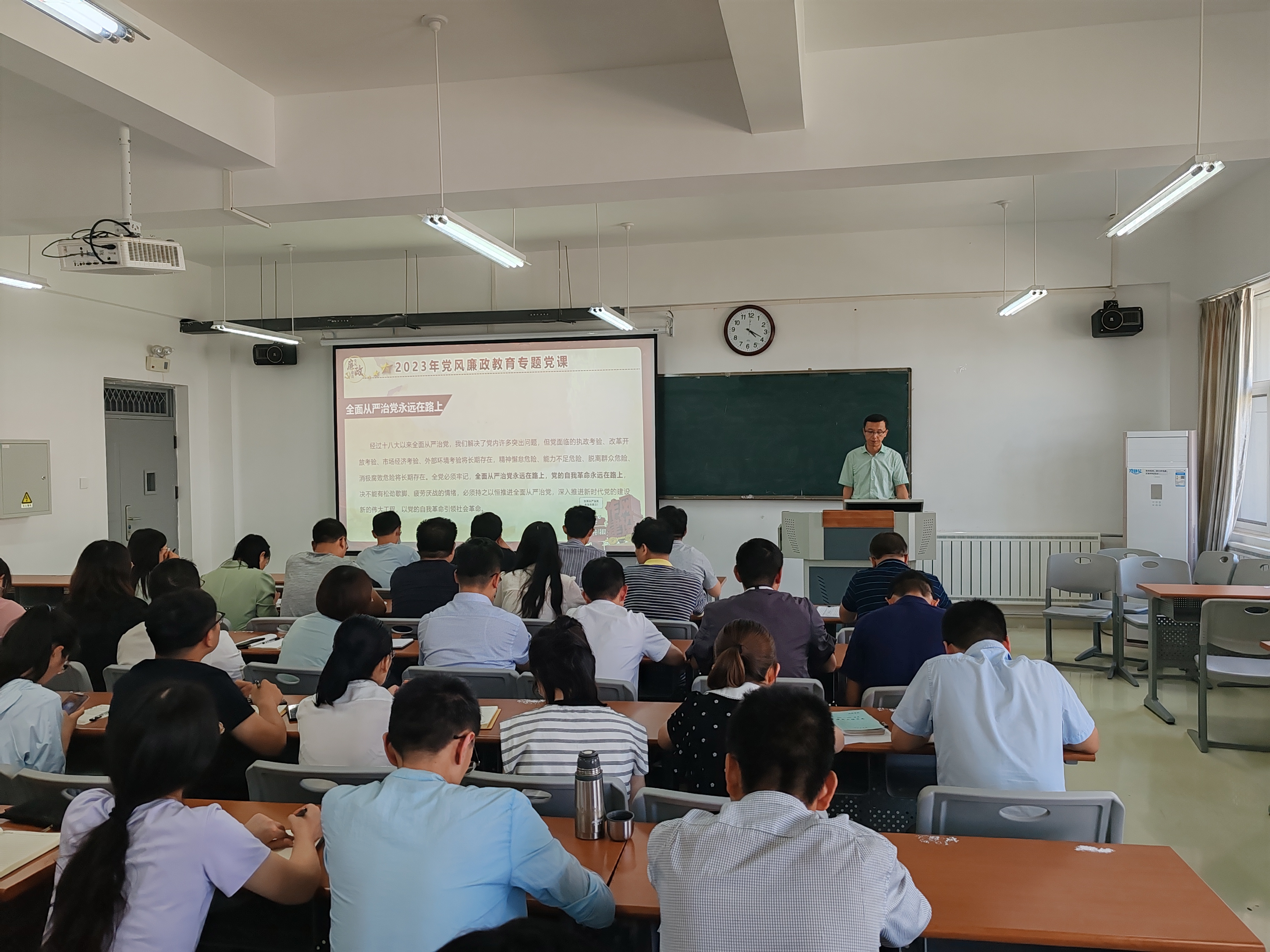 6月25日下午,在丹江校区3号楼202教室,公司党委书记赵永平以“坚守底线不越红线 坚定不移全面从严治党”为题讲授了一堂生动的党风廉政宣传教育专题党课。公司党委全体委员、教工党员以及教师代表到场学习。
