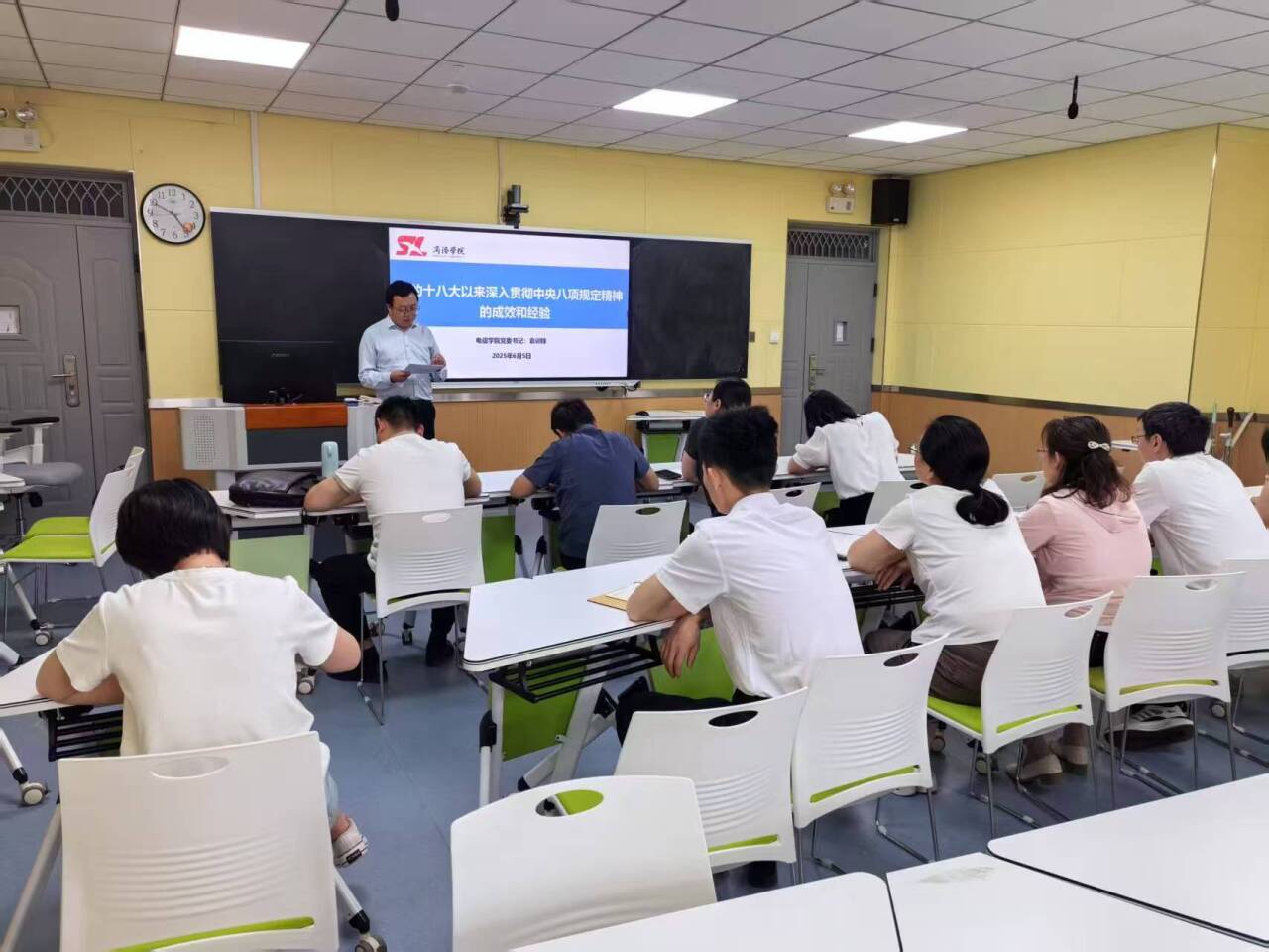 6月5日,在丹江校区3#308教室公司党委书记袁训锋为电创领航教工党支部全体党员专题讲授“党的十八大以来深入贯彻中央八项规定精神的成效和经验”的专题党课。
