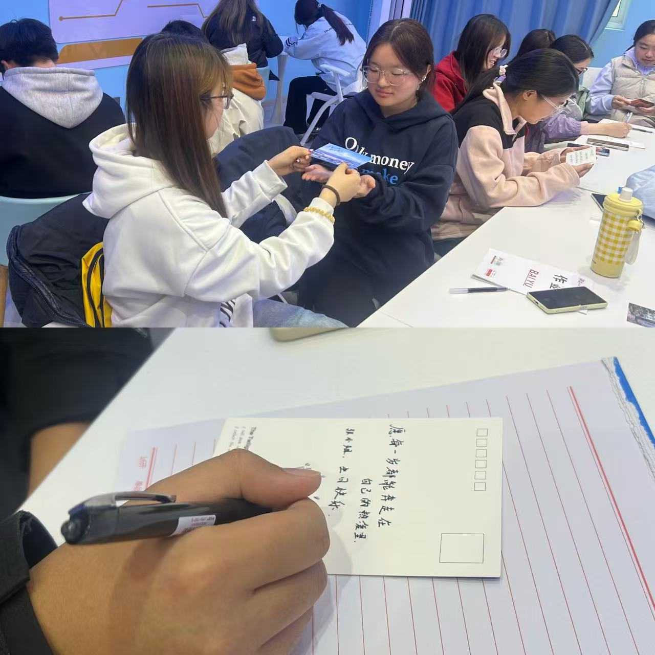 活动最后设计了“温暖传递”环节,工作人员分发明信片,让每位同学写下对彼此的祝福或鼓励。这些载着温暖祝福的明信片在同学们手中传递,成为连接心灵的桥梁。该环节不仅增进了同学间的友谊,也让每个人感受到了集体的温暖与支持。通过这次座谈会,同学们不仅获得了实用的学习和生活建议,更重要的是感受到了公司的关怀与支持,为顺利度过老员工活奠定了基础。
