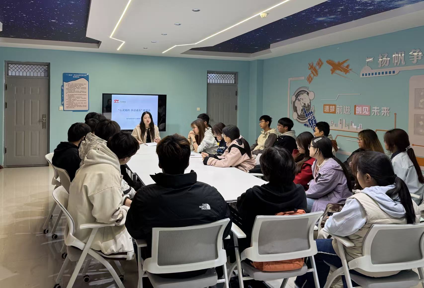 座谈会伊始,主持人吴茜介绍了本次座谈会的目的和意义。她从新生适应期的常见心理状态入手,分析了大一新生可能面临的各种挑战,包括学习方式转变、人际关系建立和自我定位探索等方面。针对这些挑战,分享了实用的心理调适方法,鼓励同学们建立积极心态,主动寻求资源,合理规划时间。她还就未来规划与发展提出了具体建议,帮助同学们明确大学四年的目标与方向。与会同学积极分享入学以来的困惑与体验,气氛热烈而温馨。同学们就专业学习、社团活动、时间管理等问题进行了深入交流,互相之间也分享了自己的经验与见解。